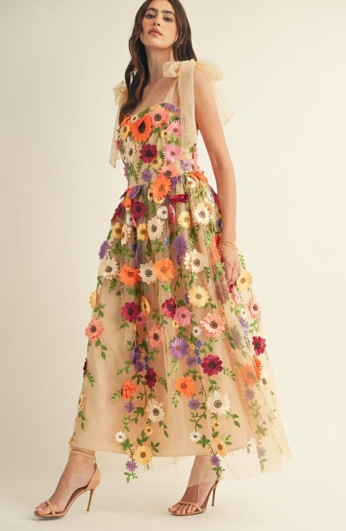 Step into a dreamy garden afternoon with the 3D Floral Midi Dress. Every detail, from the all-over floral texture to the shoulder tie straps, evokes playful elegance and feminine charm. The midi length moves gracefully with every step, creating a whimsical silhouette perfect for brunches, garden parties, or sunset strolls.
