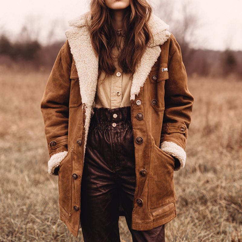 Autumn Winter Outfit Brown Shearling Coat With Leather Pants