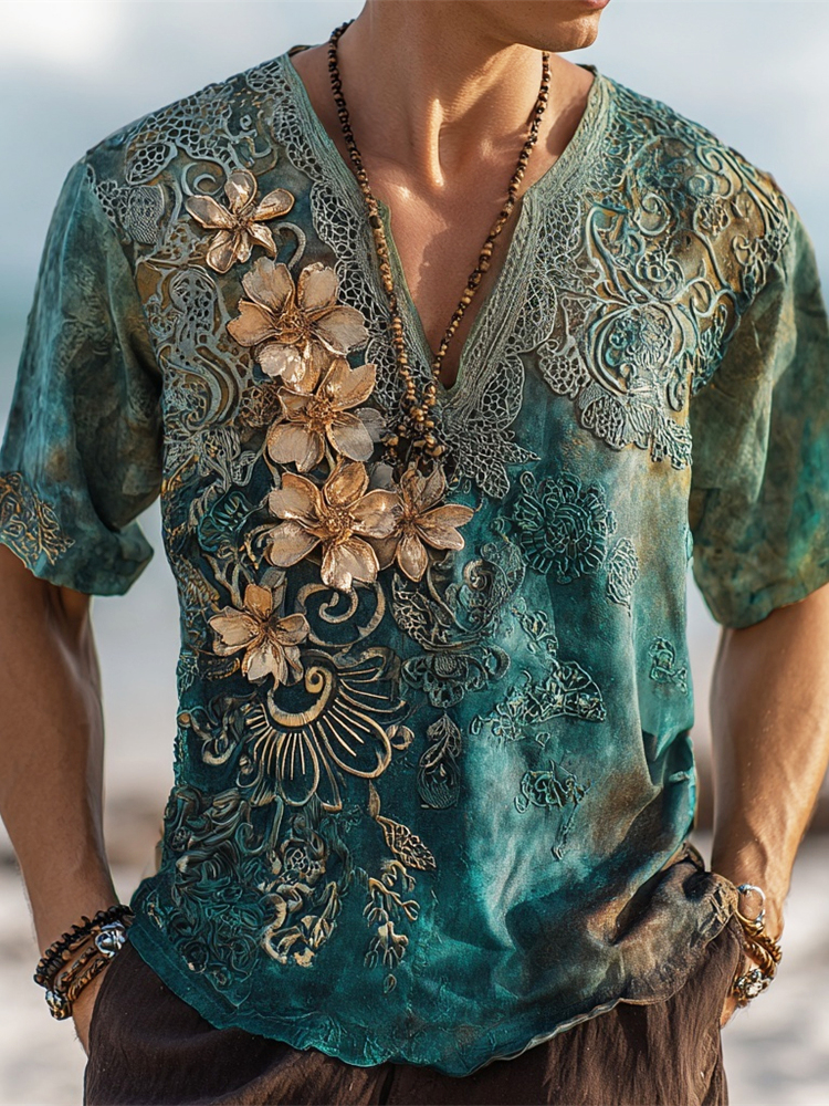 Boho Vintage Floral Embroidery Men's Linen V-neck Shirt