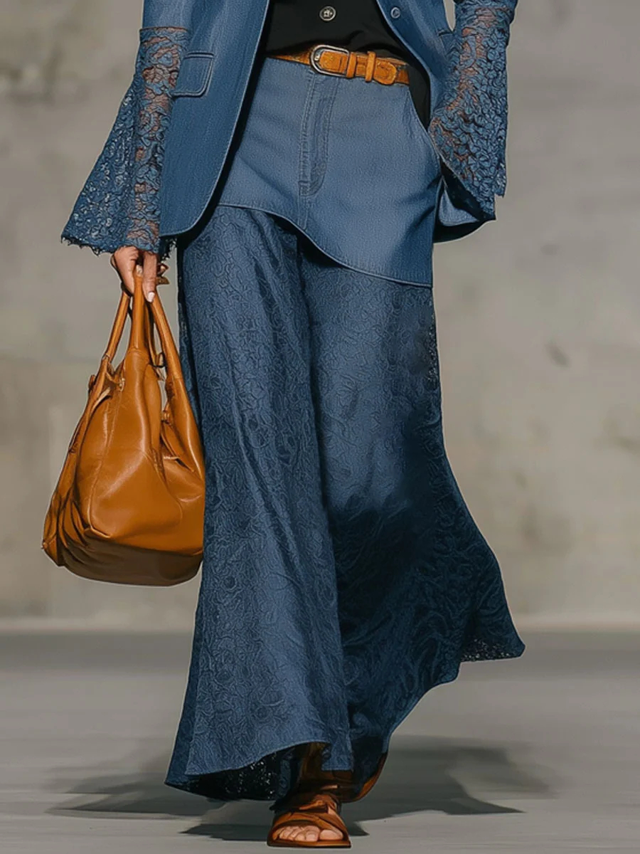 💙 Casual Retro Blue Blended Lace Paneled Wide-Leg Skirt Pants