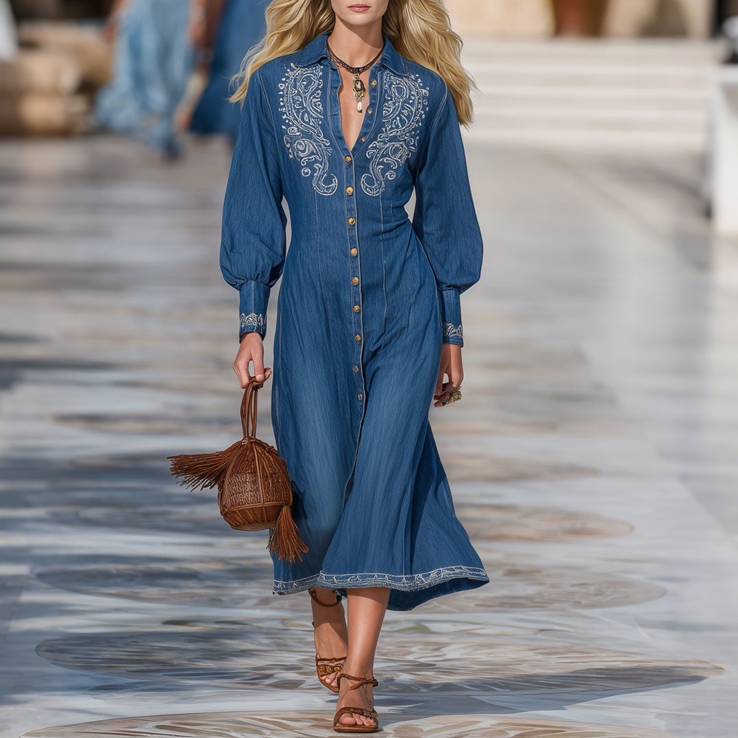 Casual Vintage Paisley Blue Denim Long Sleeve Midi Dress