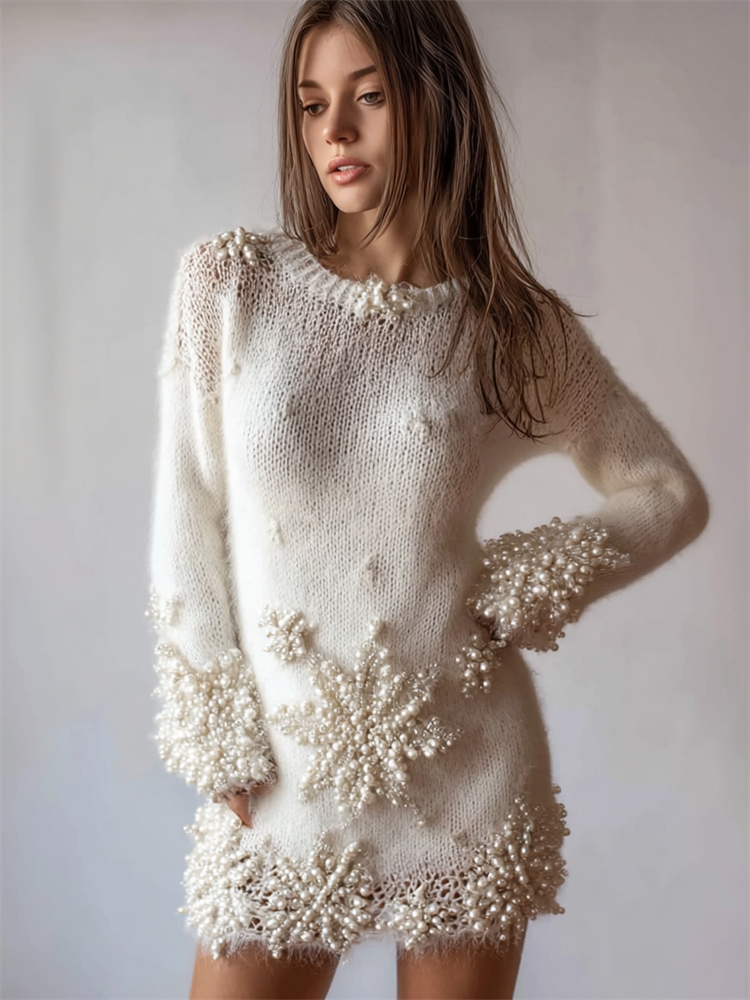 Classy Pearls Snowflakes Cozy Fuzzy Sweater Dress