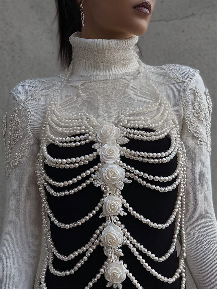 Classy Roses Skeleton Pearls Lace Embroidered Turtleneck Sweater
