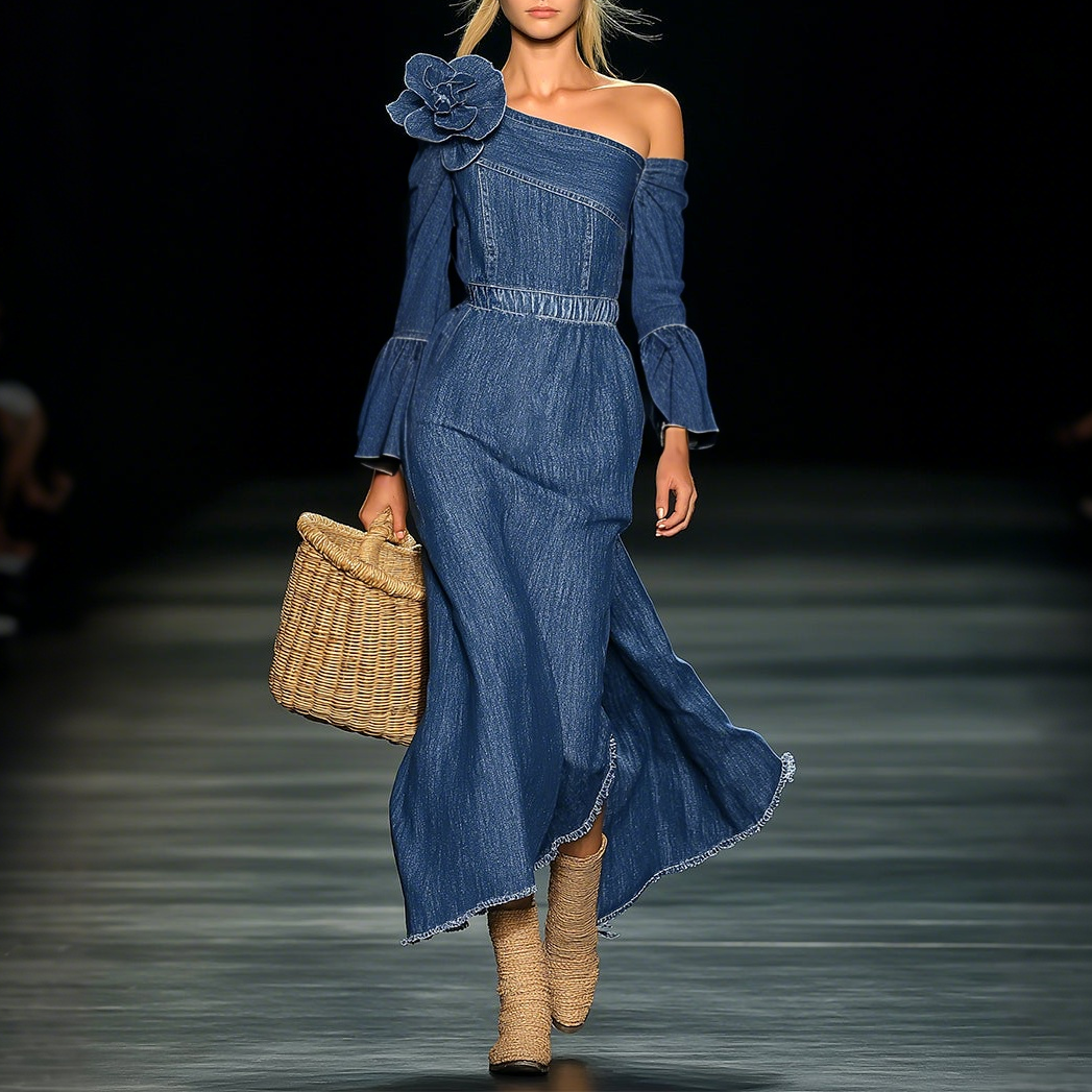 Elegant Off-the-Shoulder Denim 3D Floral Maxi Dress