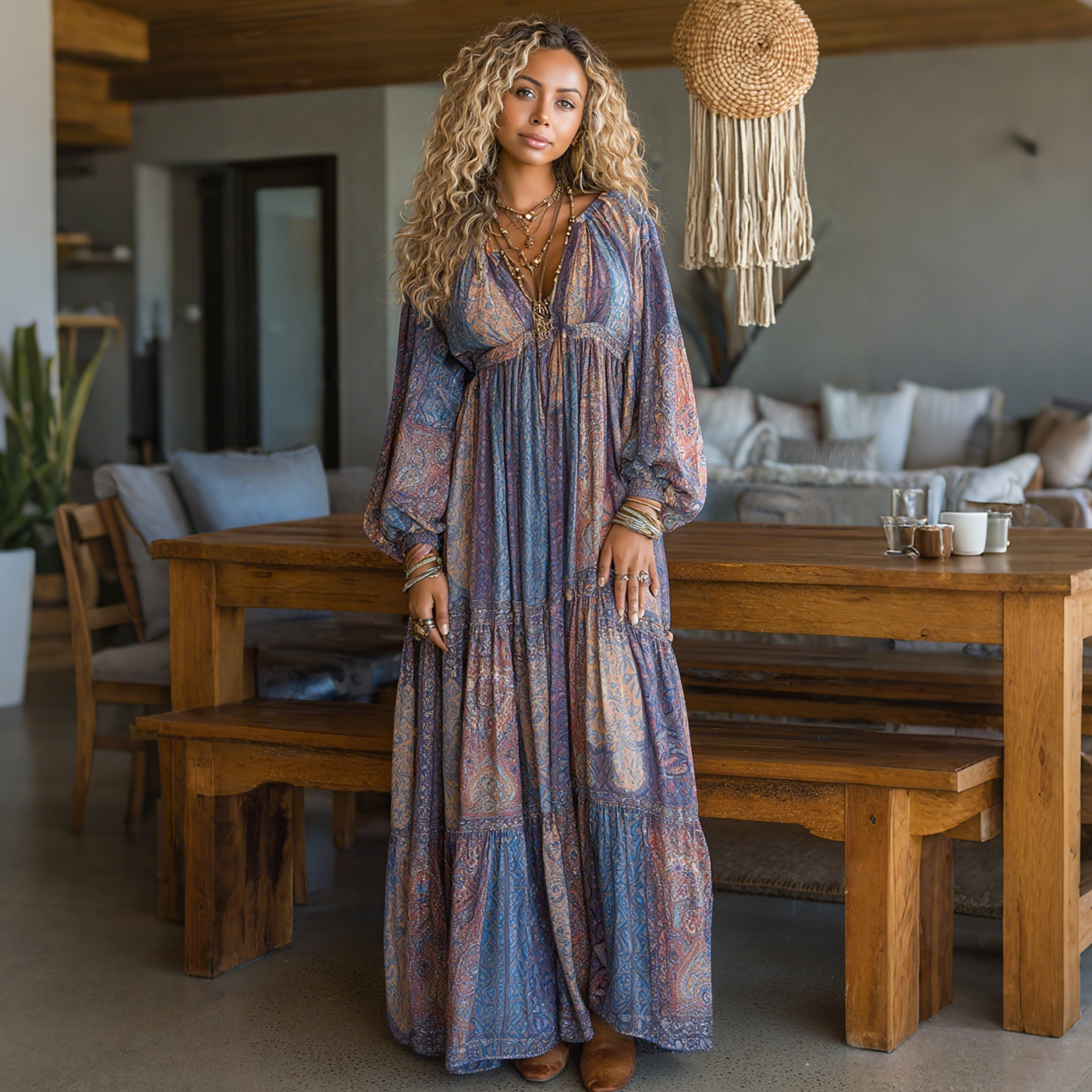 Elegant Paisley Print Long Sleeve Maxi Dress