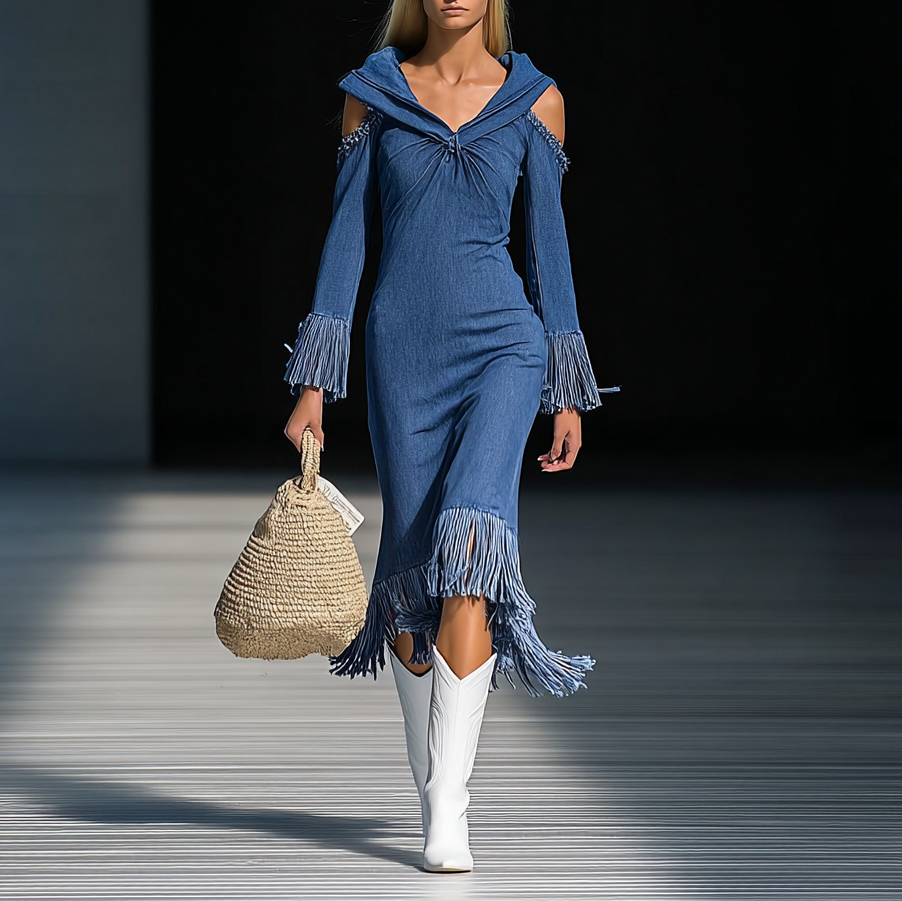 Fashionable Tassel Blue Denim Long Sleeve Hooded Midi Dress