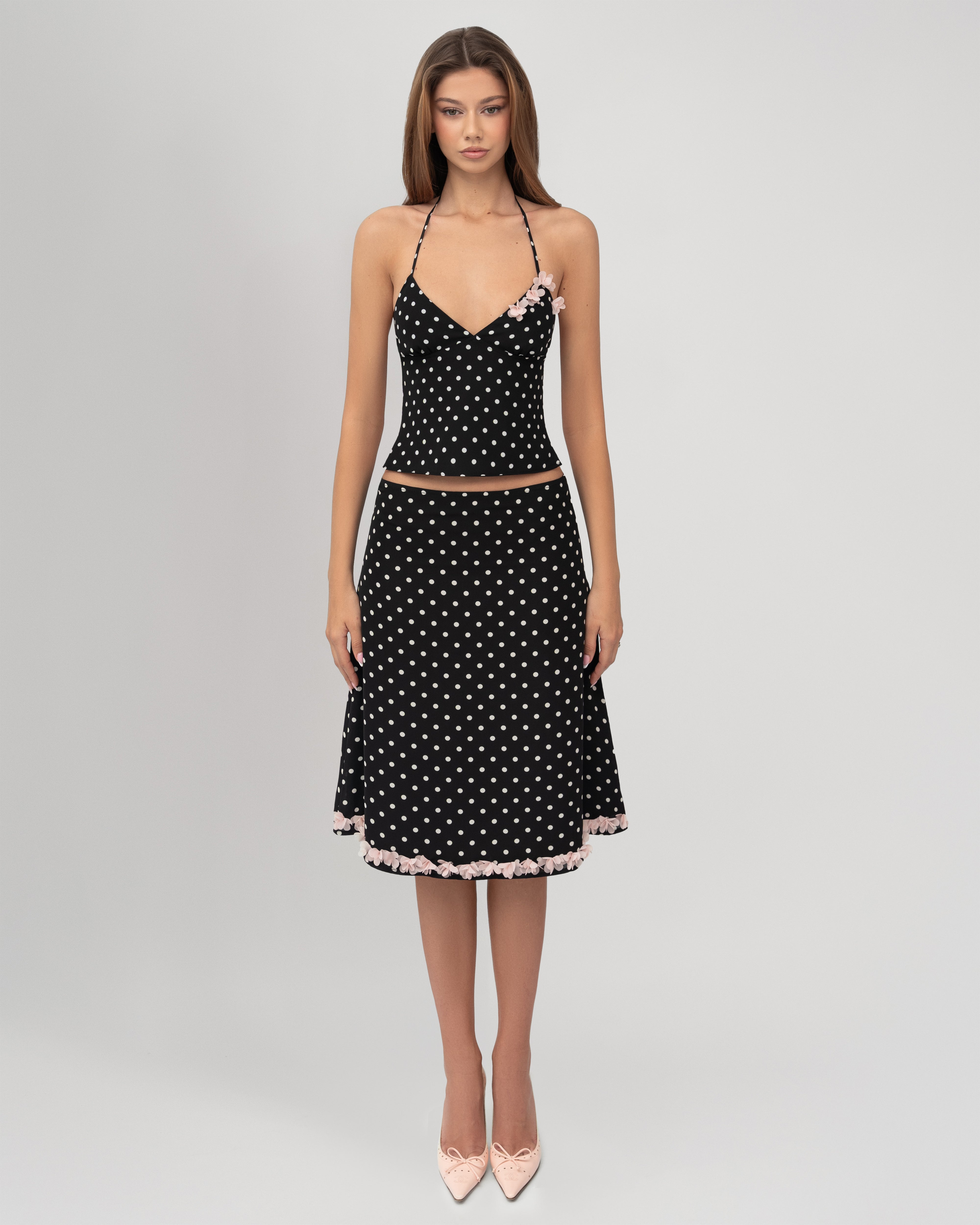Add a whimsical touch to your wardrobe with theFlora Skirt—a black and white polka dot midi skirt that balances retro charm with feminine details. Designed as part of the Flora two-piece set, this skirt features delicate floral trim and a structured silhouette, perfect for pairing with the matching halter top or mixing into your everyday looks.