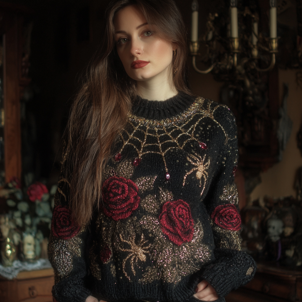 Halloween Antique Spider And Red Rose Vintage Round Neck Sweater