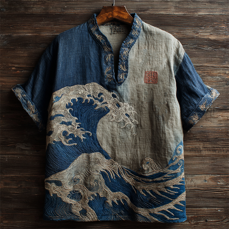 Japanese Great Sea Wave Embroidered Contrast Linen Shirt