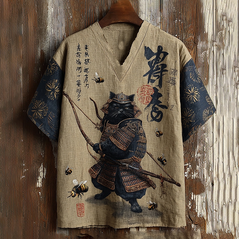 Japanese Warrior Cat And Bees Art Contrast Linen V Neck Shirt