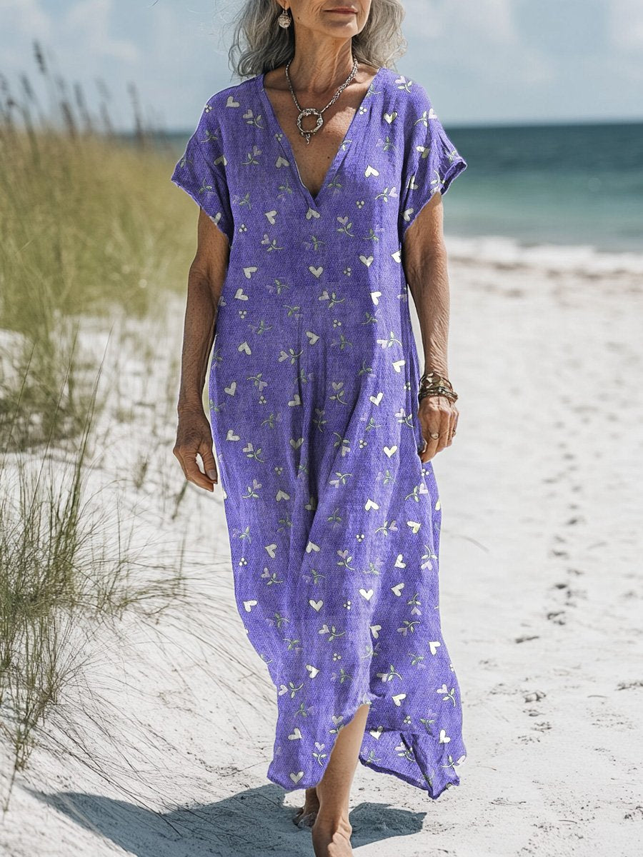 Lilac Floral And Heart Pattern Printed Women's Pocket Cotton Dress