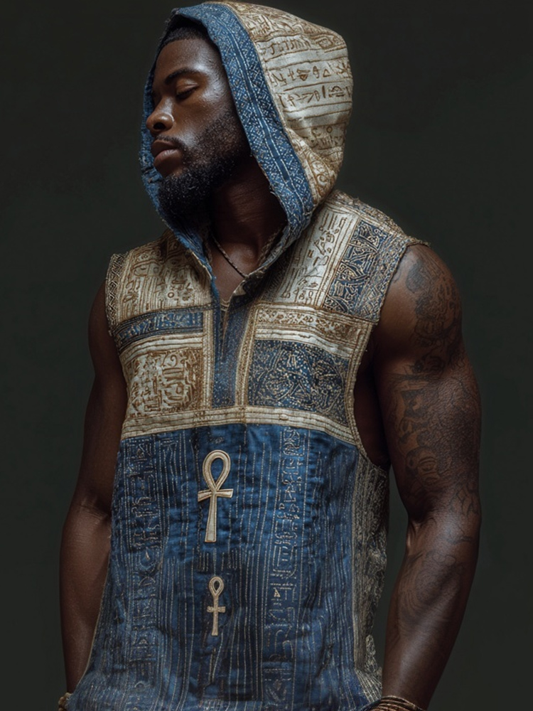 Men's Ancient Egyptian Ankh Pattern Hooded Linen Tank