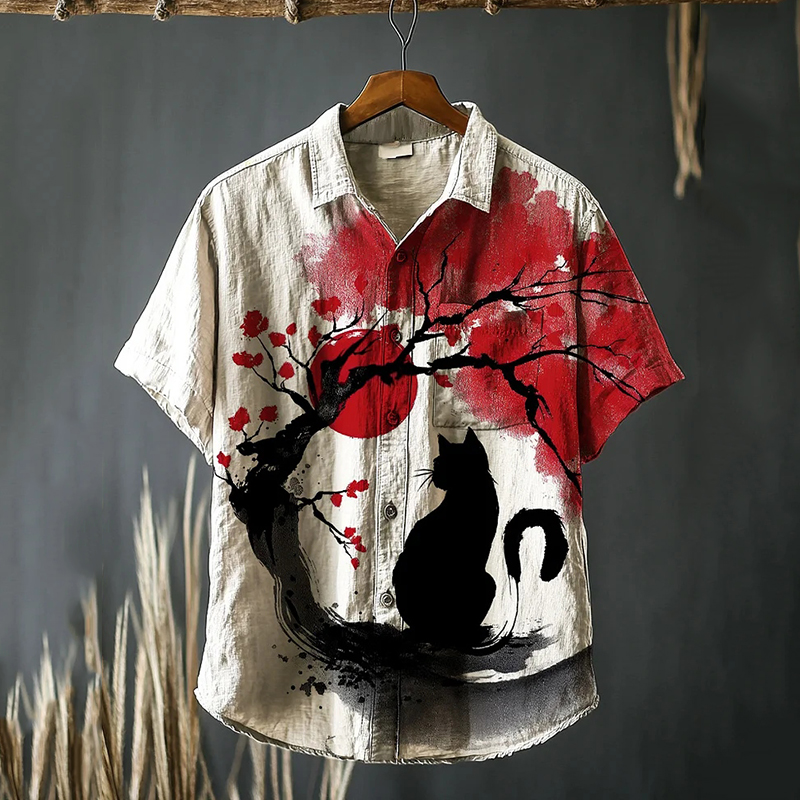 Men's Cat Under The Cherry Tree Japanese Art Print Short Sleeve Shirt