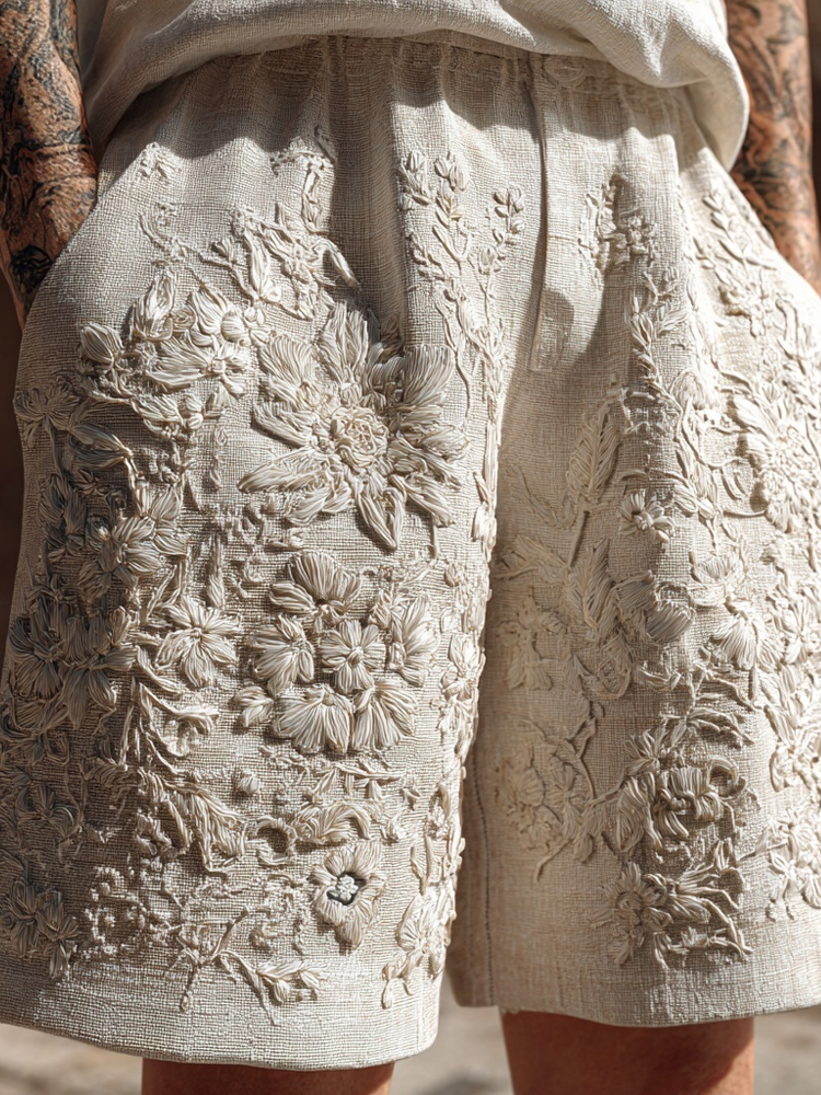 Men's Floral Lace Embroidered Vintage Linen Shorts
