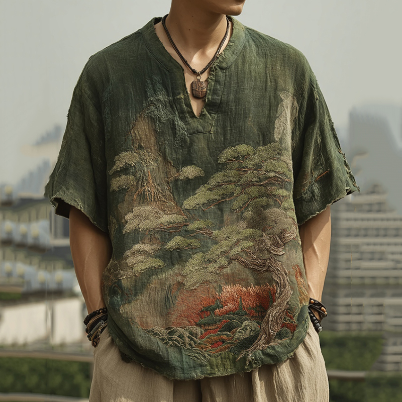 Men's Retro Pine And Cypress Landscape Embroidery Casual Short Sleeve Shirt