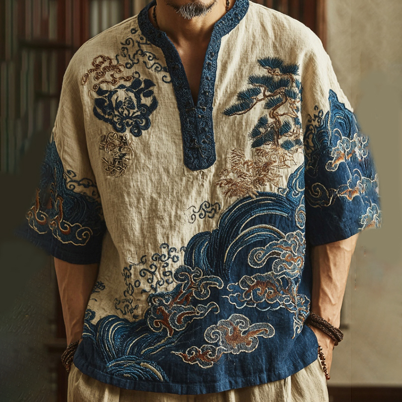 Men's Retro Pine And Cypress Wave Embroidery Casual Short Sleeve Shirt
