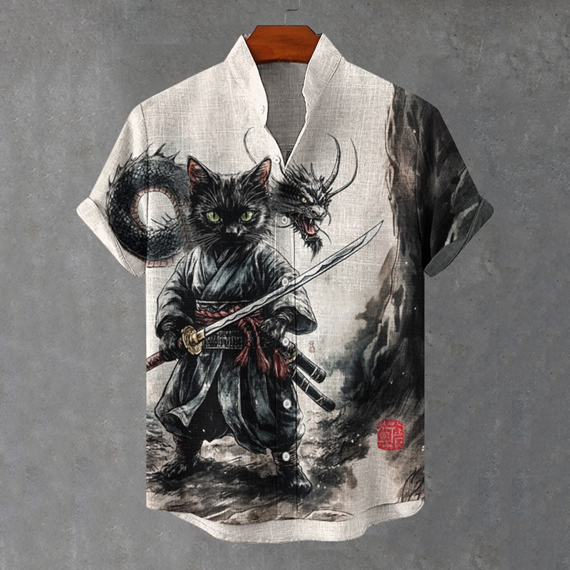 Men's Samurai Black Cat And Dragon Art Print Short Sleeve Shirt