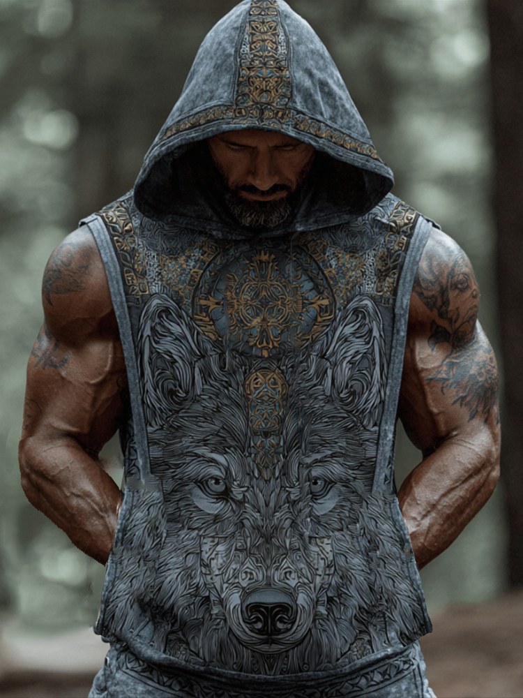 Men's Viking-style Embroidered Wolf Totem Hoodie With Sleeveless Top