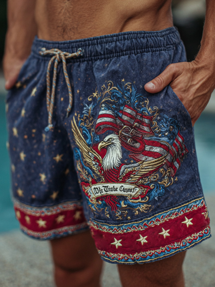 Men's Vintage Bald Eagle Embroidered Linen Shorts