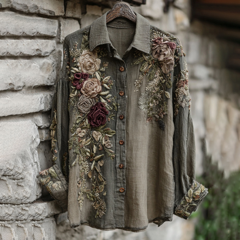 Men's Vintage Floral Embroidered Art Button Down Linen Shirt