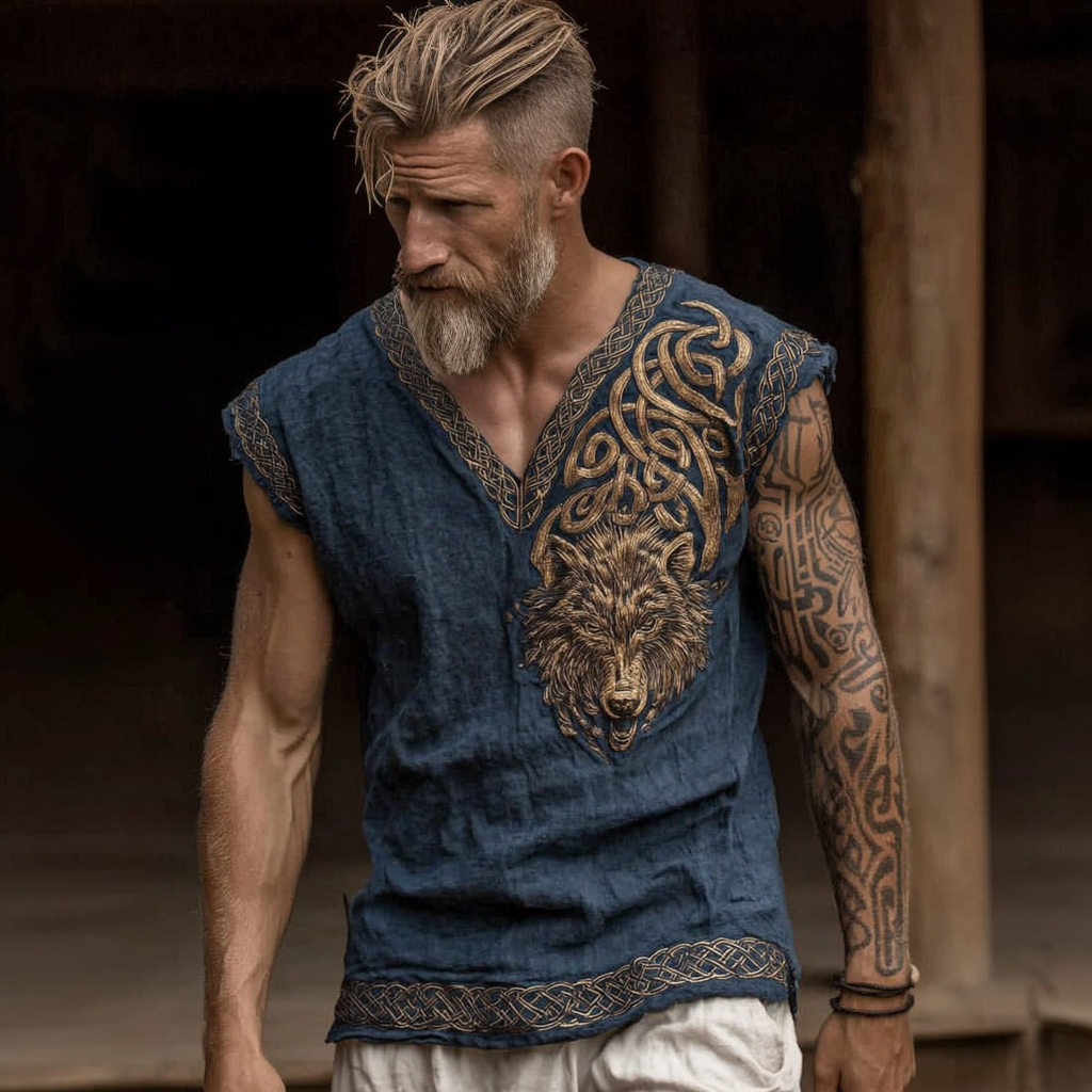 Men's Vintage Viking Wolf Embroidered Art V Neck Tank Top