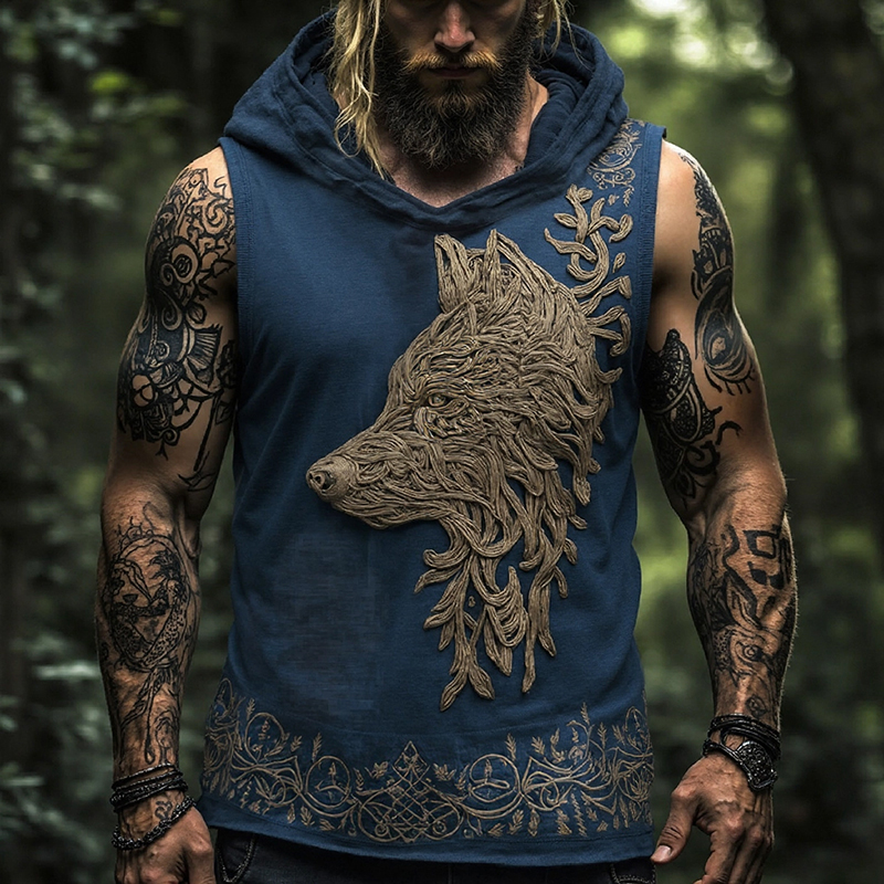 Men's Vintage Viking Wolf Pattern Linen Sleeveless Hooded Tank Top