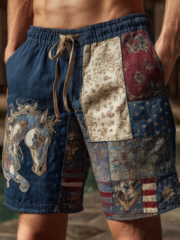 Men's Western Horse Embroidered Vintage Patchwork Linen Shorts