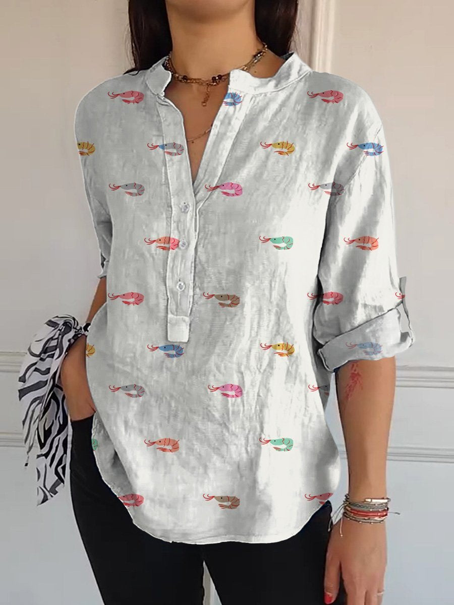 Petite Shrimp Pattern Printed Women's Casual Long Sleeve Comfortable Cotton Shirt