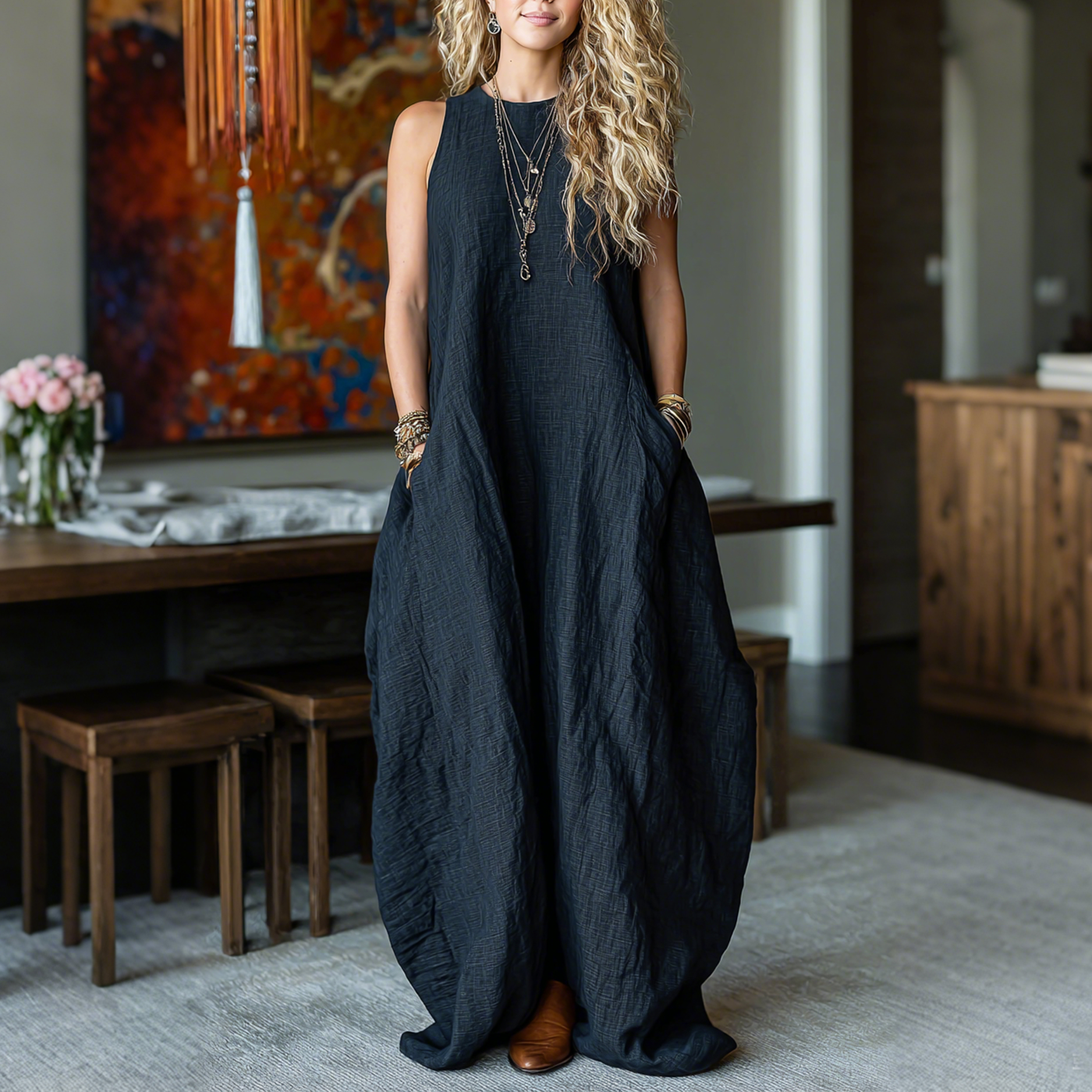 Design Details: Sleeveless tank neckline, oversized loose fit, deep side pockets, flowy floor-length skirt