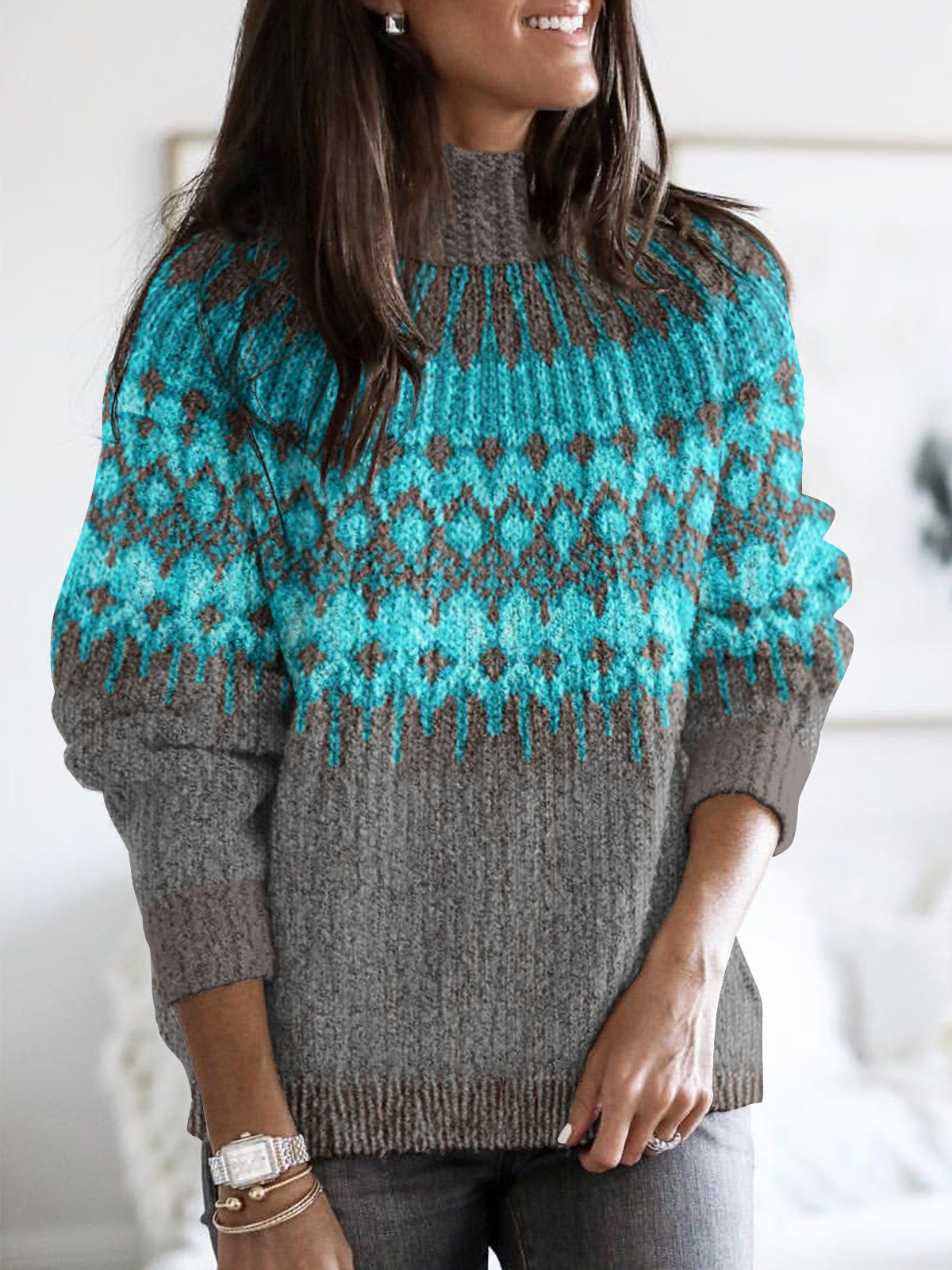 Retro Contrast Geometric Pattern Turtleneck Sweater