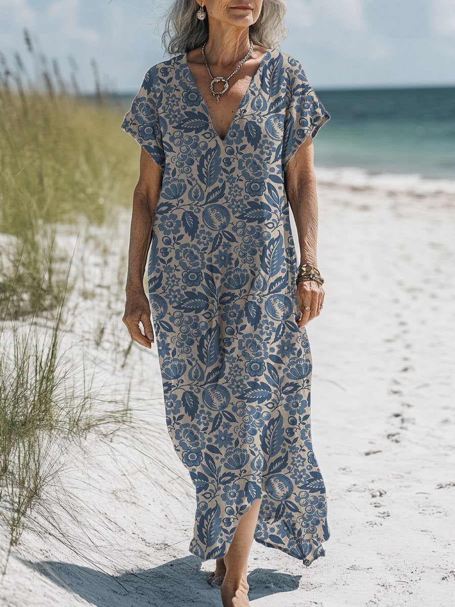 Retro Summer Fruit Pattern Printed Women's Pocket Cotton Dress