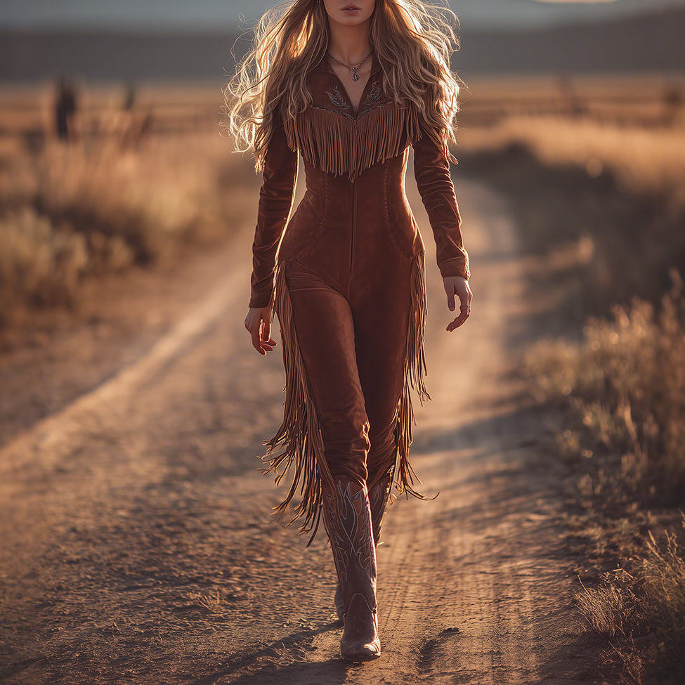 Retro Western Style Neckline Embroidered Tassel Long Sleeve Brown Suede Jumpsuit