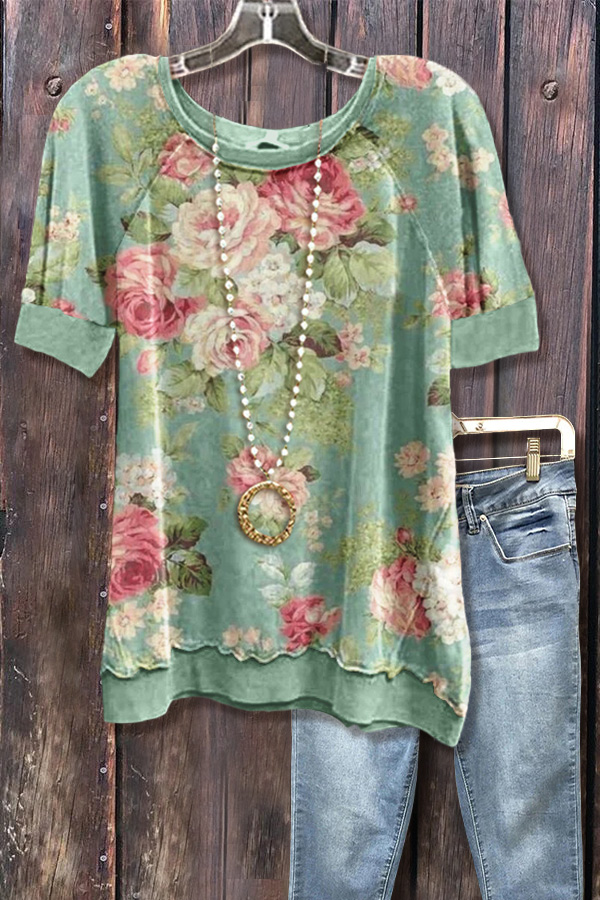 Spring Floral Print Short Sleeve Sweatshirt
