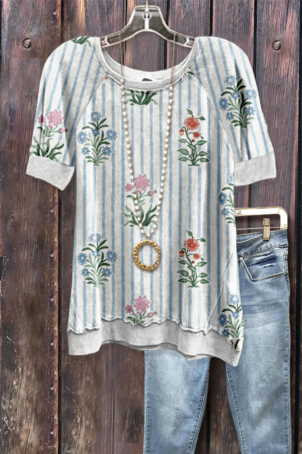 Striped Floral Print Short Sleeve Sweatshirt
