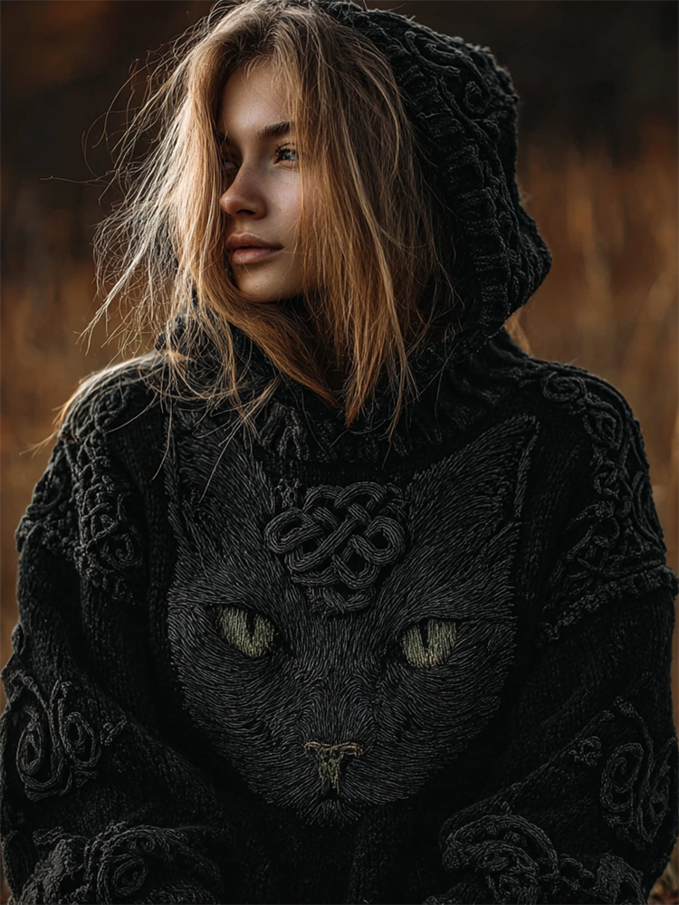 Vintage Celtic Black Cat Cozy Knit Hooded Sweater