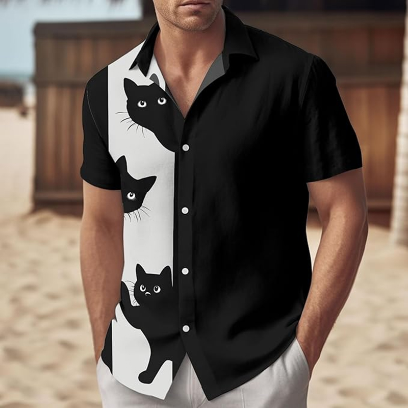 Vintage Cute Black Cat Lovers Hawaiian Art Casual Short Sleeve Shirts