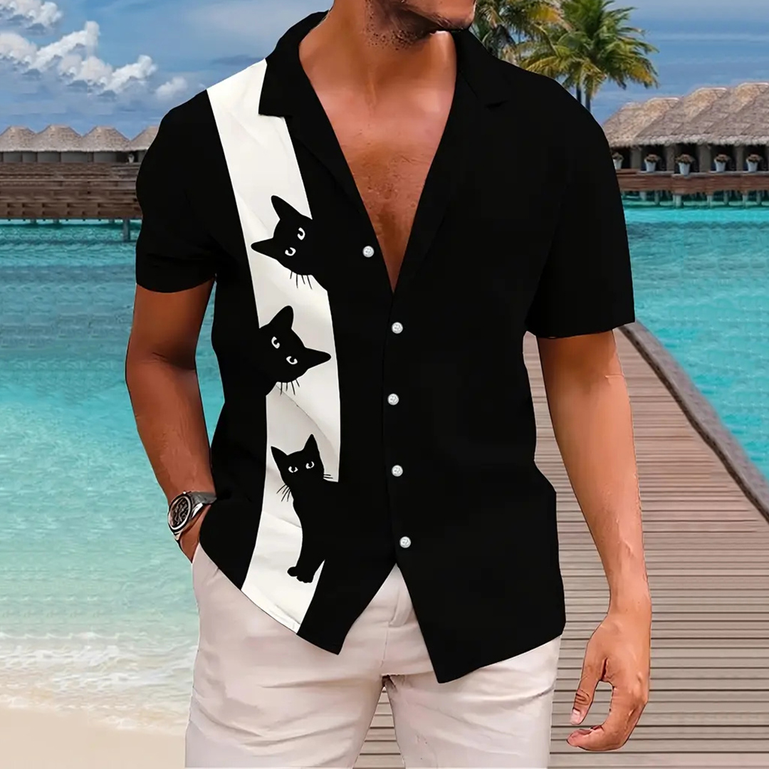 Vintage Cute Black Cat Lovers Hawaiian Art Casual Short Sleeve Shirts