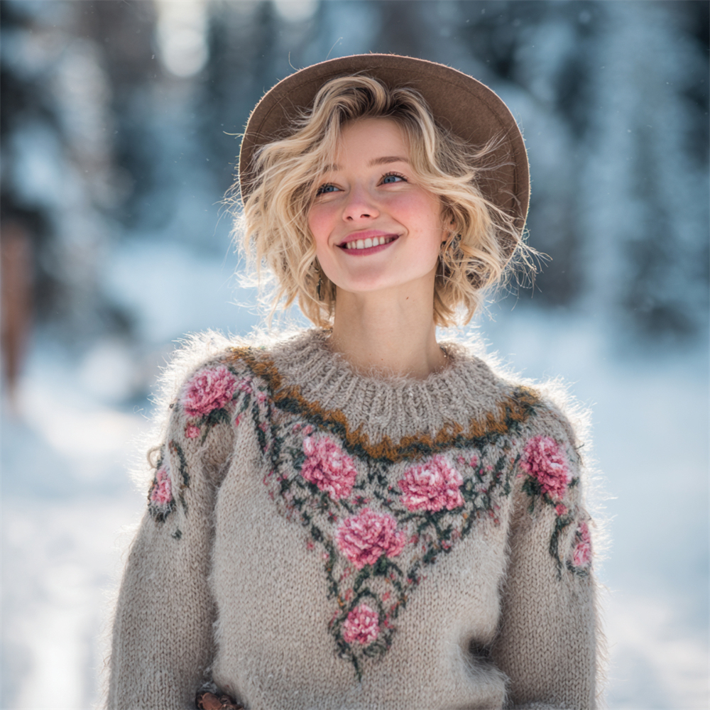 Vintage Floral Knit Embroidery Art Women's Icelandic Sweater