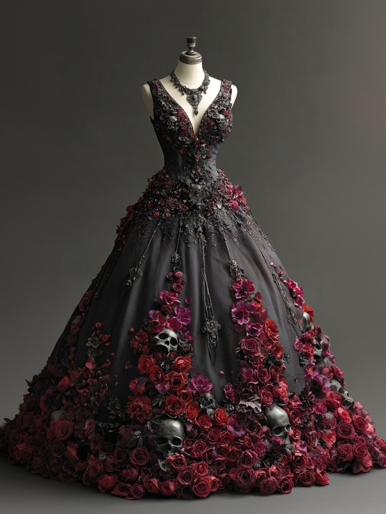 Vintage Gothic Roses & Skulls Embroidered V Neck Maxi Dress