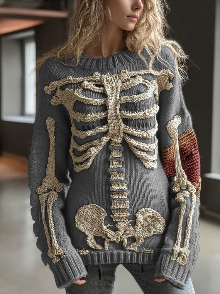 Perfect for layering during spring, fall, and winter, its chunky knit adds warmth while the anatomy art detailing gives a unique edgy look for daily wear or festive occasions.