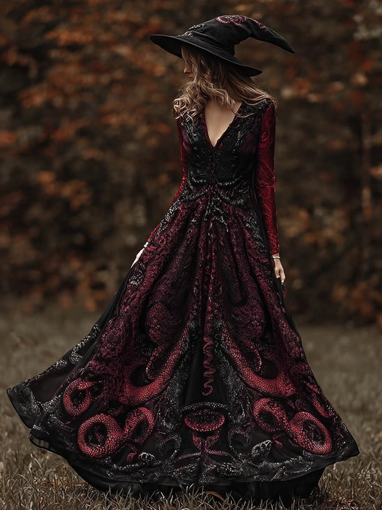 Vintage Halloween Snake Inspired V Neck Maxi Dress