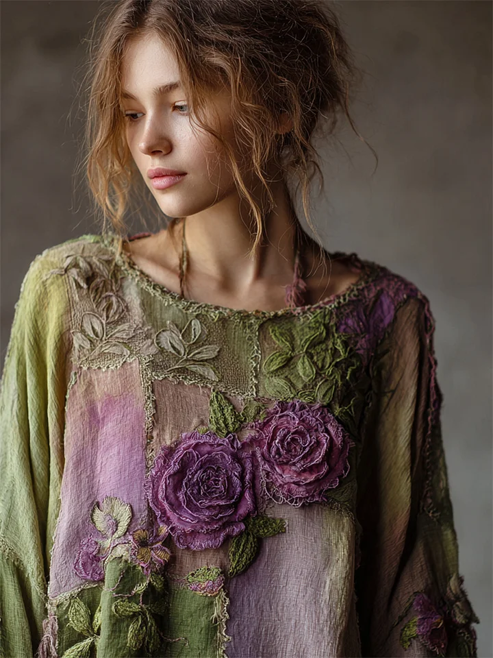 Vintage Purple Roses Forest Patchwork Flowy Linen Tunic
