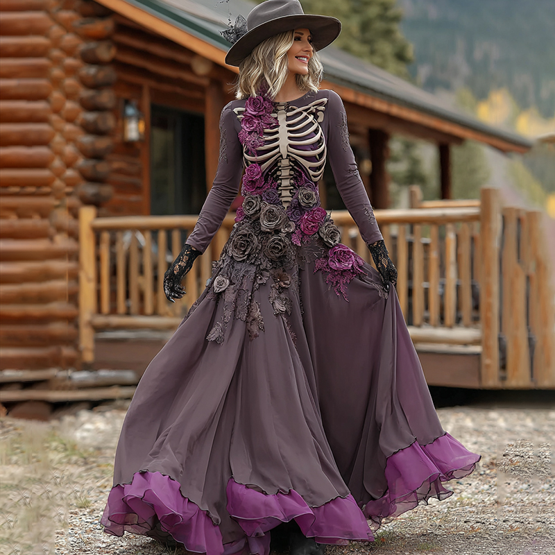 Vintage Skull Black Rose Pattern Patchwork Maxi Dress