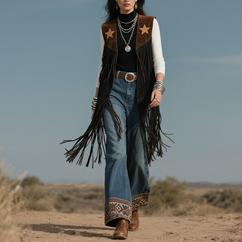 • Design Elements: Fringed vest with star details, flared jeans with embroidered hems