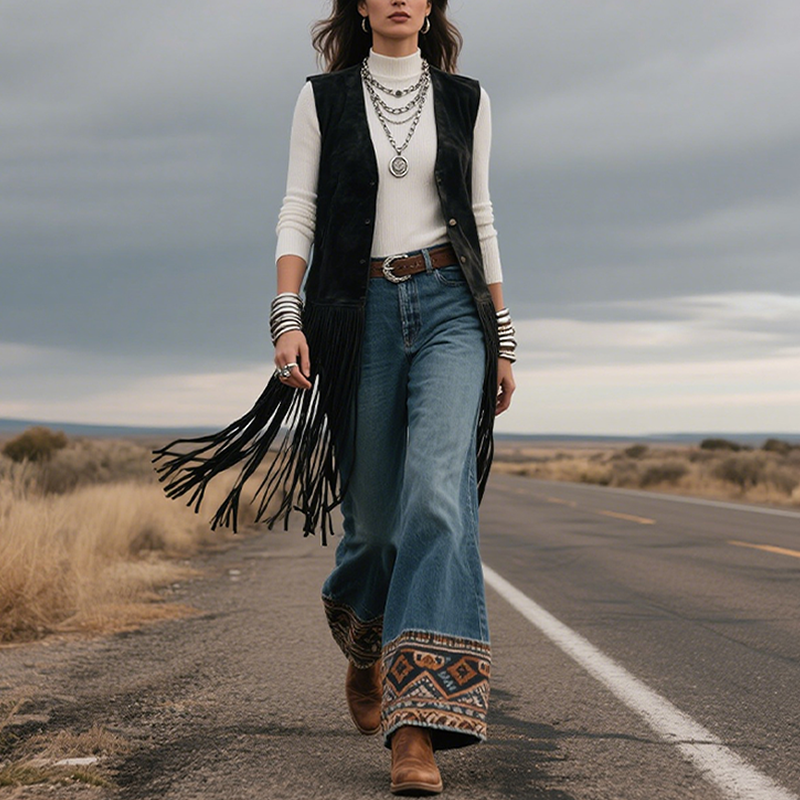 • Design Elements: Layered necklaces, fringed vest, embroidered jeans hem