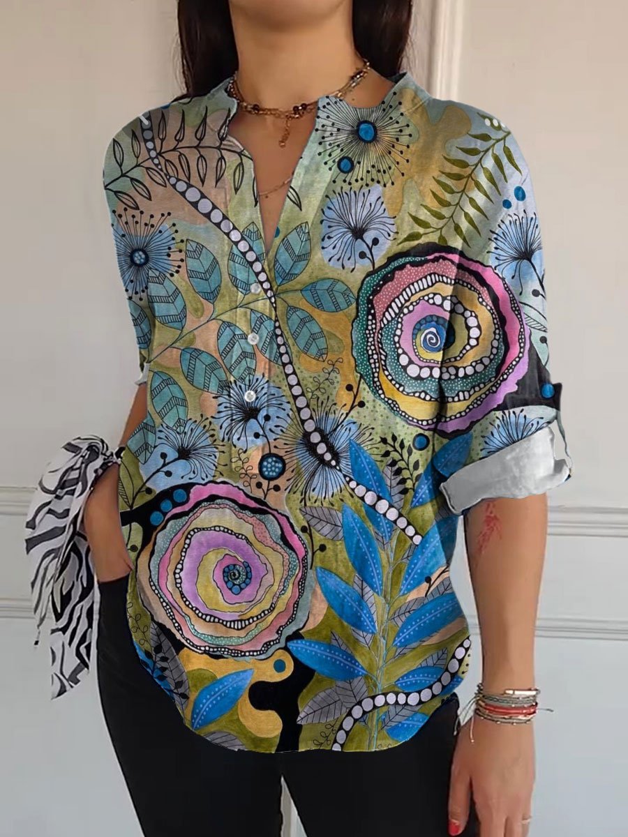 Women's Colorful Botanical Curl Art Print Casual Long Sleeve Comfortable Cotton Shirt