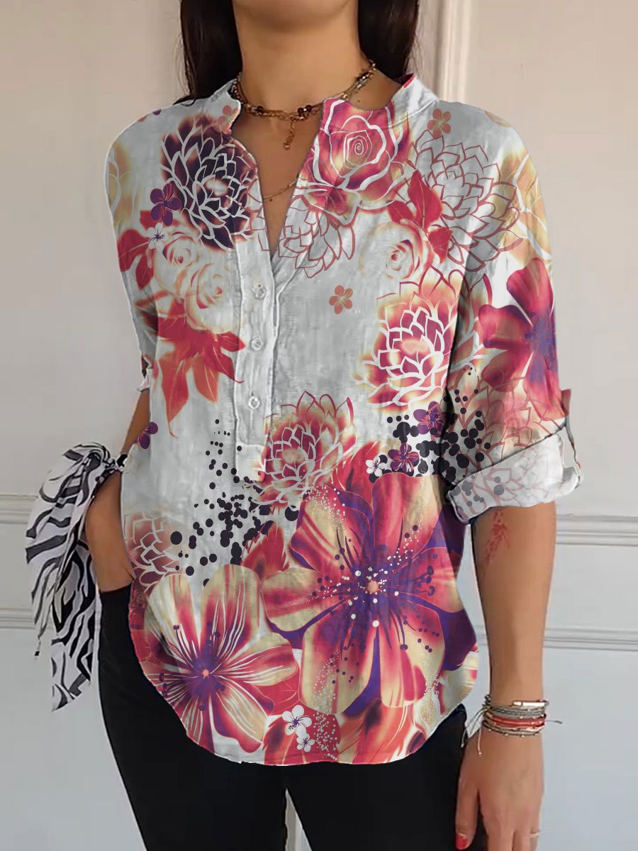Women's Colorful Flower Art Print Casual Long Sleeve Comfortable Cotton Shirt