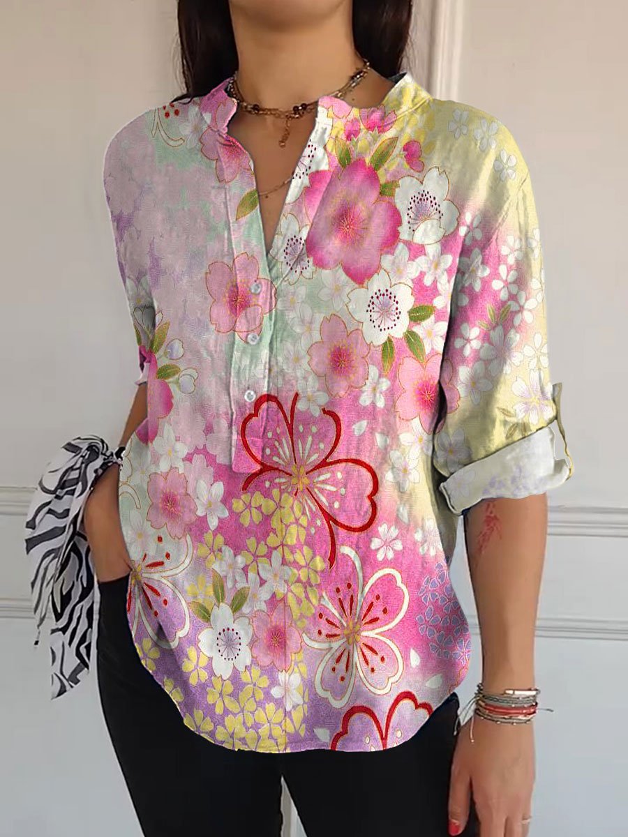 Women's Colorful Flower Art Print Casual Long Sleeve Comfortable Cotton Shirt