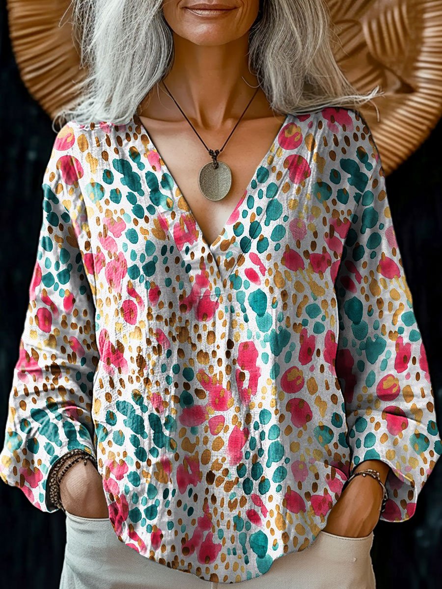 Women's Colorful Polka Dot Art Print Casual Cotton And Linen V-neck Shirt
