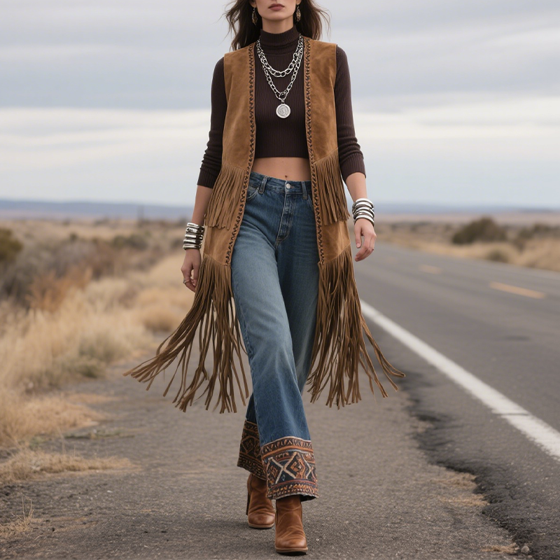 Women's Country Boho Western Chic Fringe Vest Outfit Brown